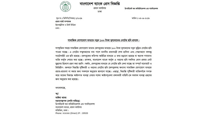 নতুন করে প্রধানমন্ত্রীর ছবিযুক্ত কোনো নোট বাজারে ছাড়ার সিদ্ধান্ত হয়নি।এই ভুয়া নোটের বিষয়ে বাংলাদেশ ব্যাংক একটি বিজ্ঞপ্তিও প্রকাশ করেছে। সেখানে বলা হয়, ফেসবুকের মাধ্যমে যে নোটের ছবি দেখা যাচ্ছে, তা সম্পূর্ণ বানোয়াট ও ভিত্তিহীন। জনমনে বিভ্রান্তি সৃষ্টিকারী এ ধরনের নোটের ছবি ফেসবুকসহ অন্যান্য সামাজিক যোগাযোগ মাধ্যমে প্রচার না করতে সবার প্রতি অনুরোধ জানানো হয়েছে।এ ছাড়া ভুয়া নোট ছড়ানোয় জড়িতদের শনাক্ত করে আইনগত ব্যবস্থা নিতে আইনশৃঙ্খলা বাহিনীকে বলা হয়েছে ওই বিজ্ঞপ্তিতে।