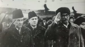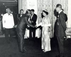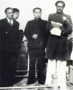 ১৯৫৬: চীনে মাও সে-তুংয়ের সঙ্গে করমর্দন; ম্যান্ডারিন কলার স্যুটের সঙ্গে কারাকুল টুপি পরা বঙ্গবন্ধু।১৯৫৬: চীনে মাও সে-তুংয়ের সঙ্গে করমর্দন; ম্যান্ডারিন কলার স্যুটের সঙ্গে কারাকুল টুপি পরা বঙ্গবন্ধু।বাহাত্তরে লন্ডনের ১০ ডাউনিং স্ট্রিটে ব্রিটিশ প্রধানমন্ত্রী এডওয়ার্ড হিথের সঙ্গে সাক্ষাৎ, বাকিংহাম রাজপ্রাসাদে রানি এলিজাবেথের সঙ্গে সাক্ষাৎ, তিয়াত্তরের জোট নিরপেক্ষ সম্মেলন কিংবা পরের বছরের জাতিসংঘ সাধারণ পরিষদে যোগদানে তাঁর আনুষ্ঠানিক পোশাক ছিল ম্যান্ডারিন কলার স্যুট।