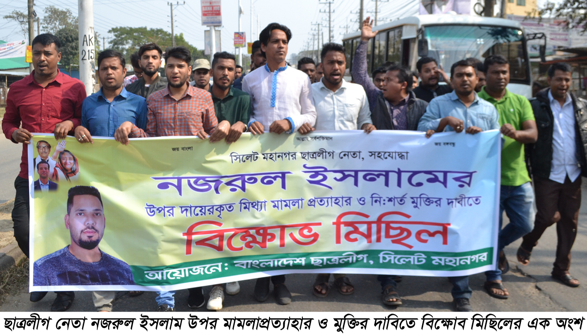সিলেট মহানগর ছাত্রলীগ নেতা নজরুল ইসলাম এর উপর মিথ্যা মামলা প্রত্যাহার ও নিস্বার্থ মুক্তির দাবিতে মহানগর ছাত্রলীগ উদ্যোগে মঙ্গলবার আখালিয়া এলাকা থেকে এক বিক্ষোক মিছিল বের হয়ে বিভিন্ন সড়ক প্রদক্ষিন