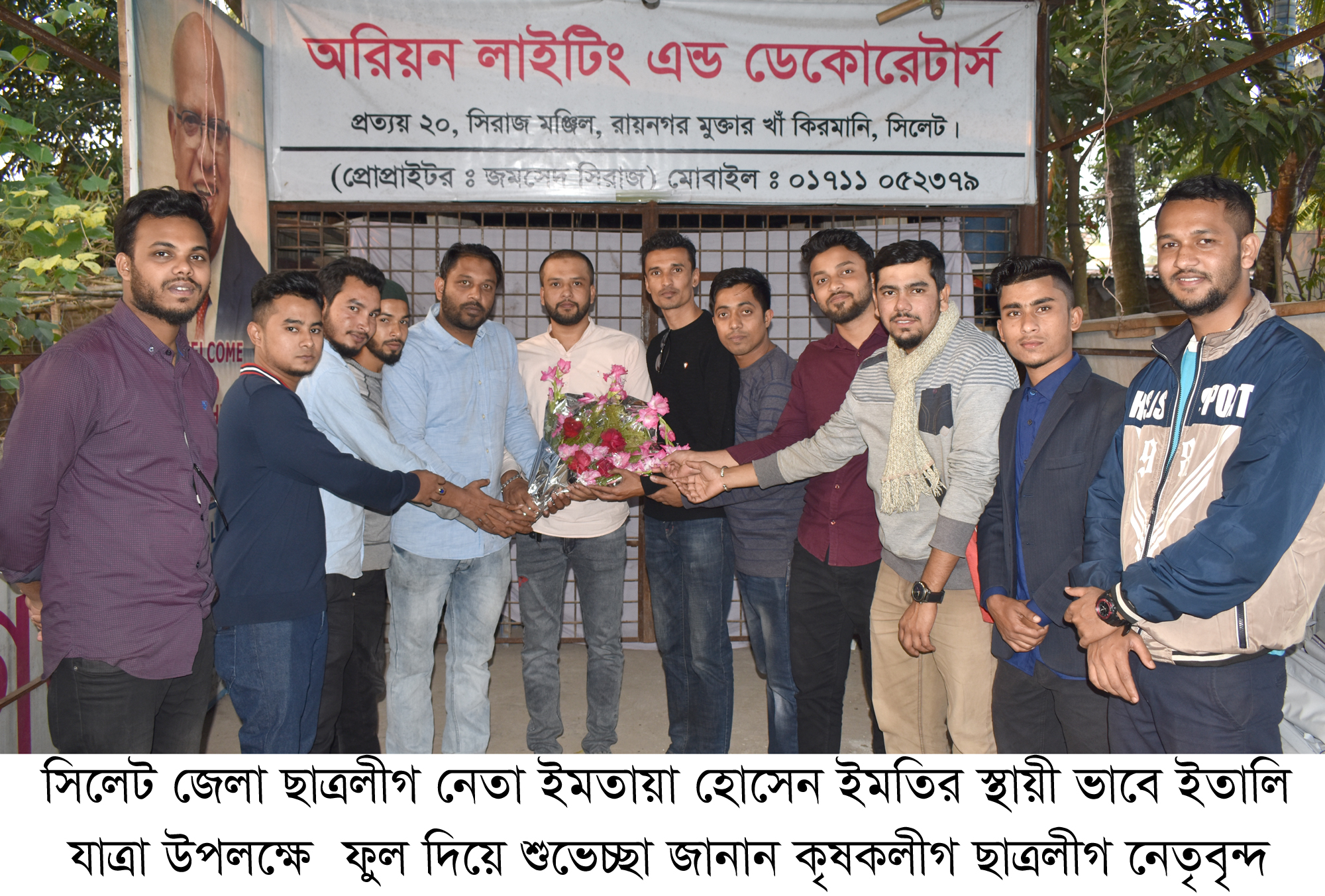 সিলেট জেলা ছাত্রলীগ নেতা ইমতায়া হোসেন ইমতির স্থায়ী ভাবে ইতালি যাত্রা উপলক্ষে এক সংবর্ধনা প্রদান করা হয়েছে। রায়নগর প্রত্যয় ২০ নং বাসায় এই সংবধর্না অনুষ্টিত হয়। ১৯ নং ওয়ার্ড ছাত্রলীগের